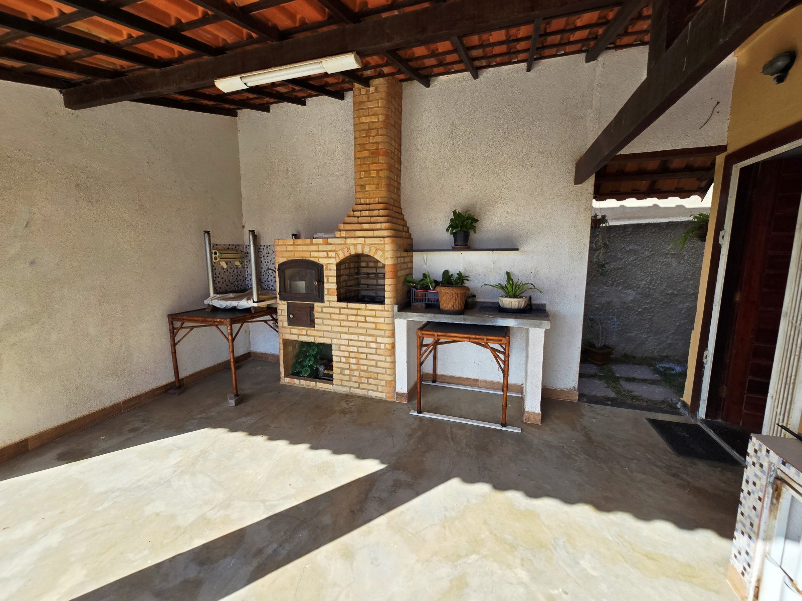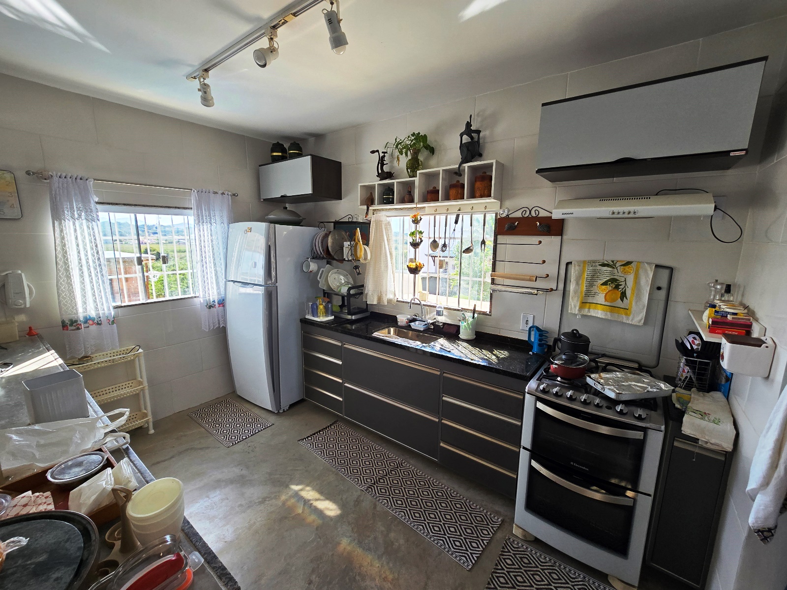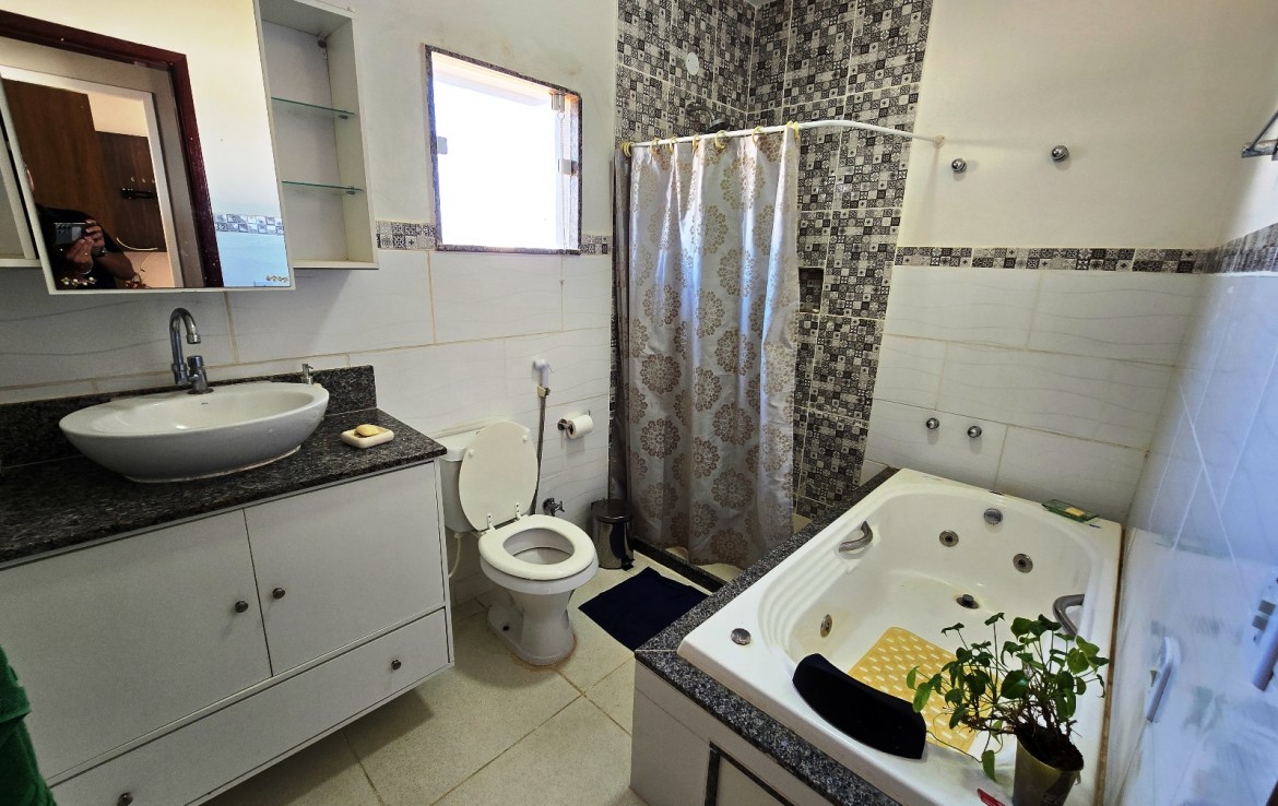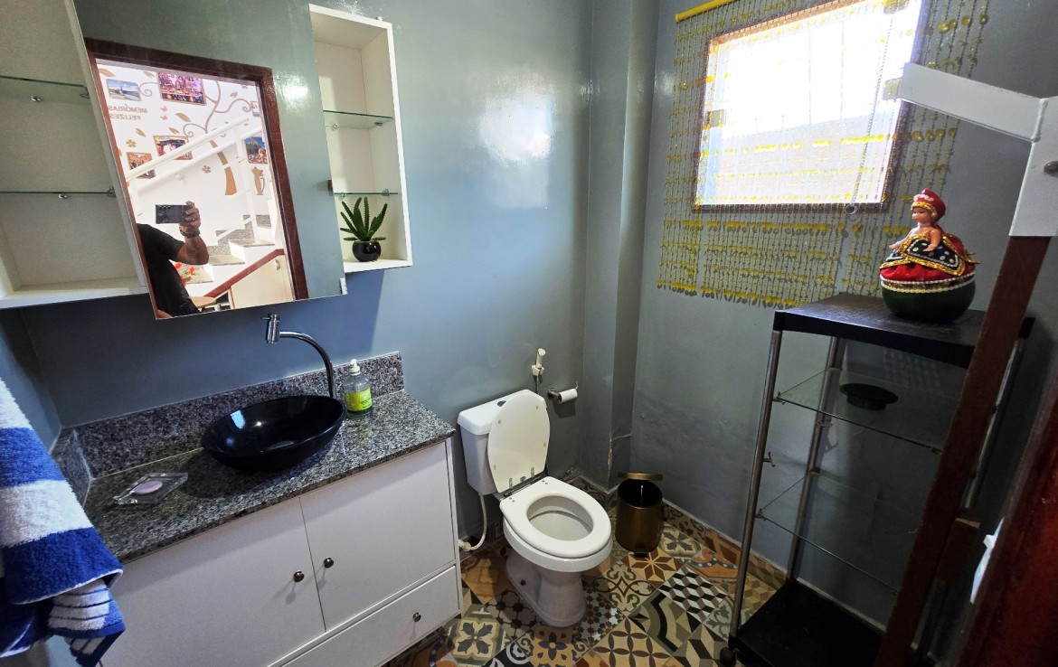 * Casa com placas de aquecimento solar que fornece água quente nos banheiros e pia da cozinha.