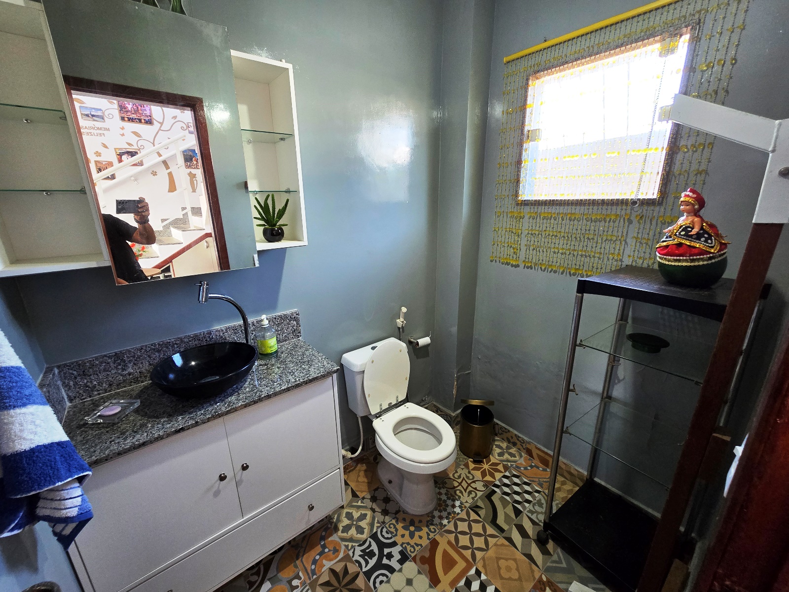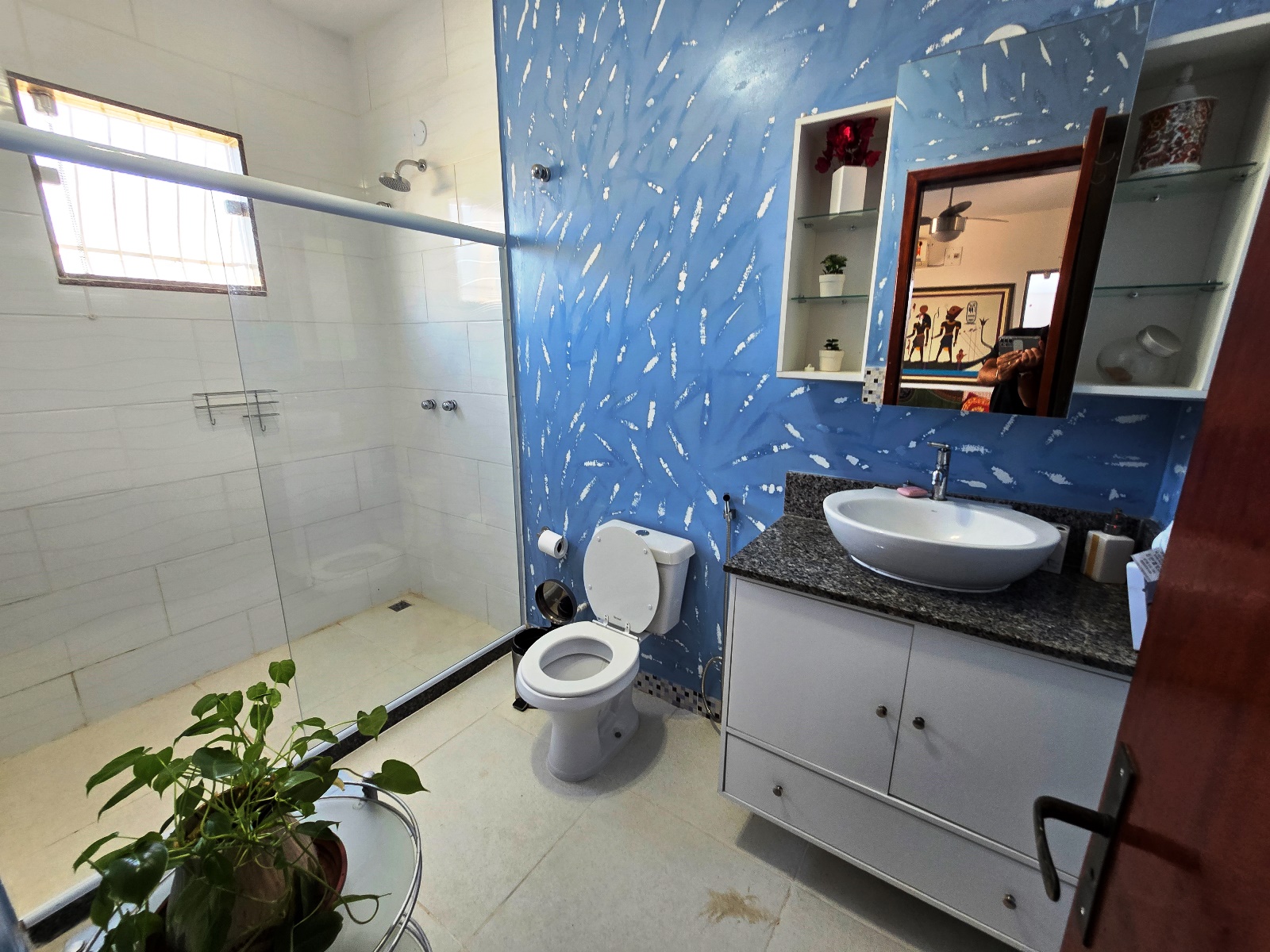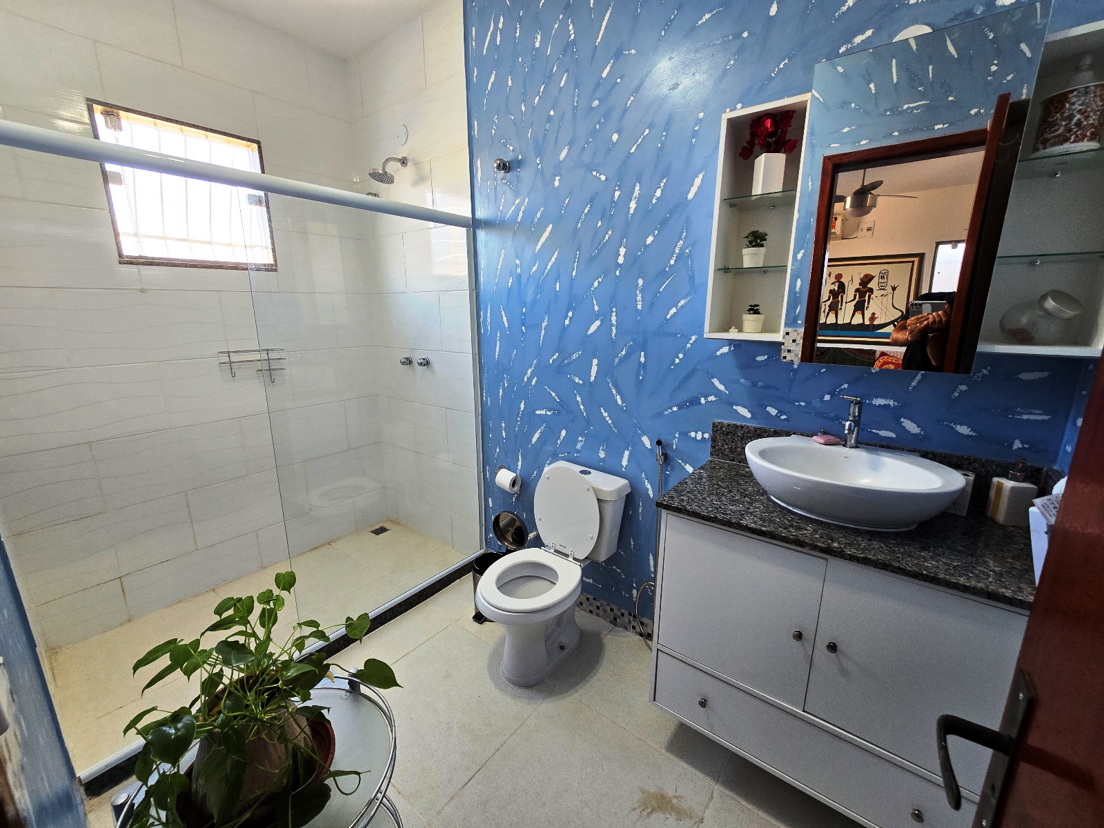* Casa com placas de aquecimento solar que fornece água quente nos banheiros e pia da cozinha.