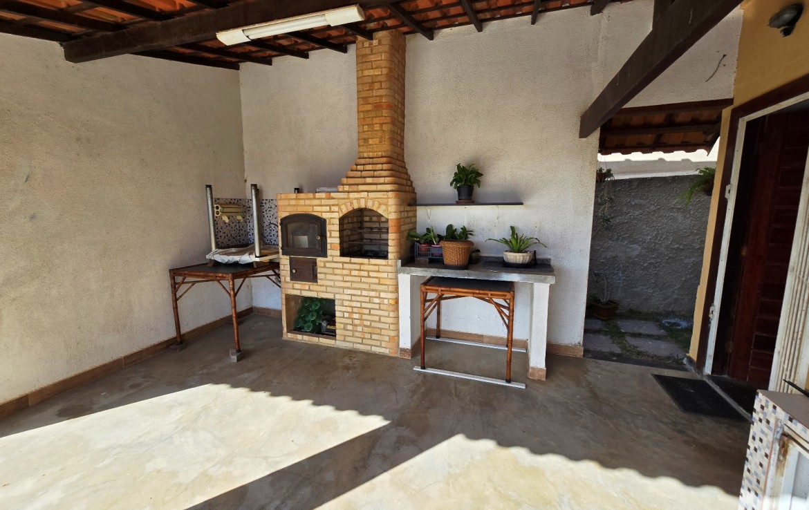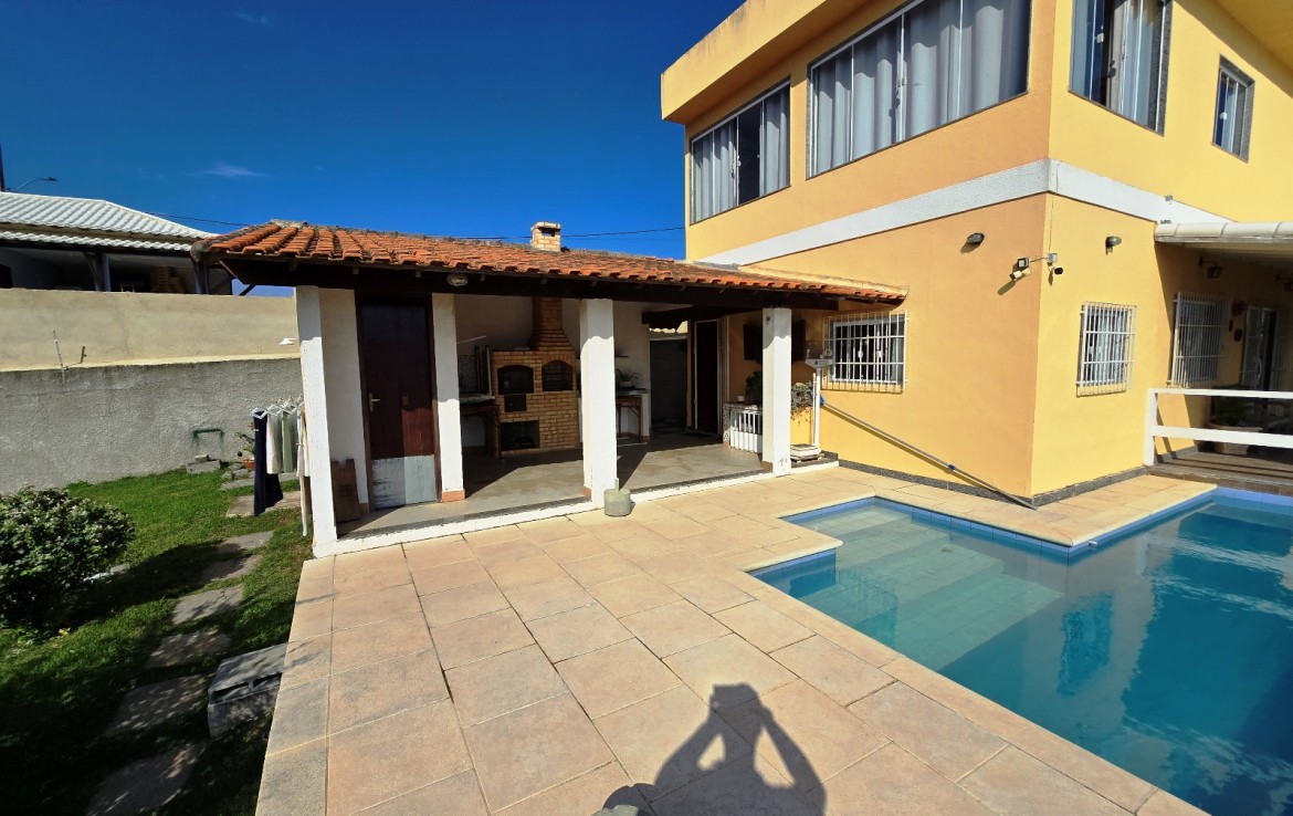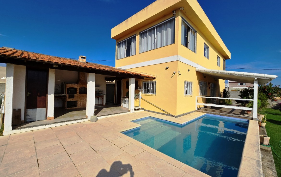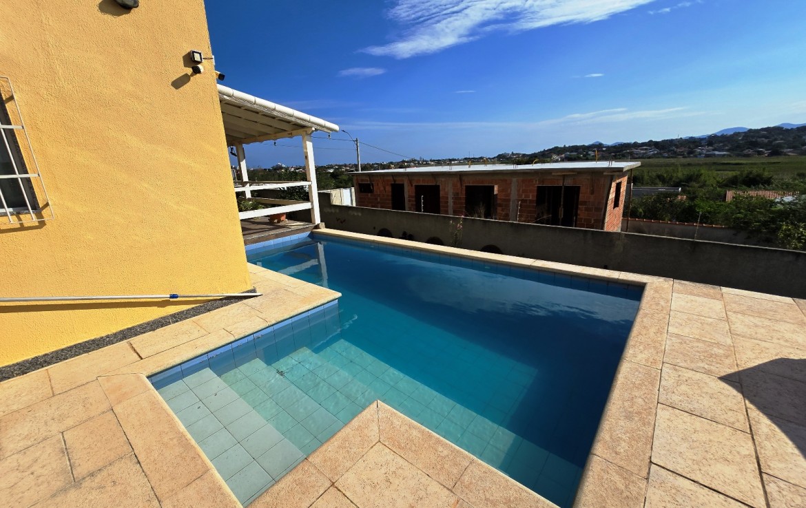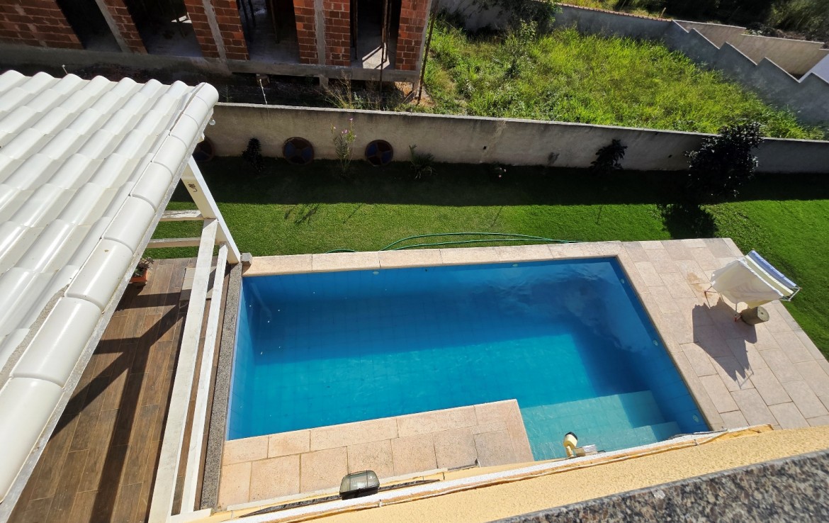 Área externa integrada, frente com varanda e vaga para 03 carros, piscina e espaço churrasqueira/área gourmet com banheiro social e campinho de futebol.