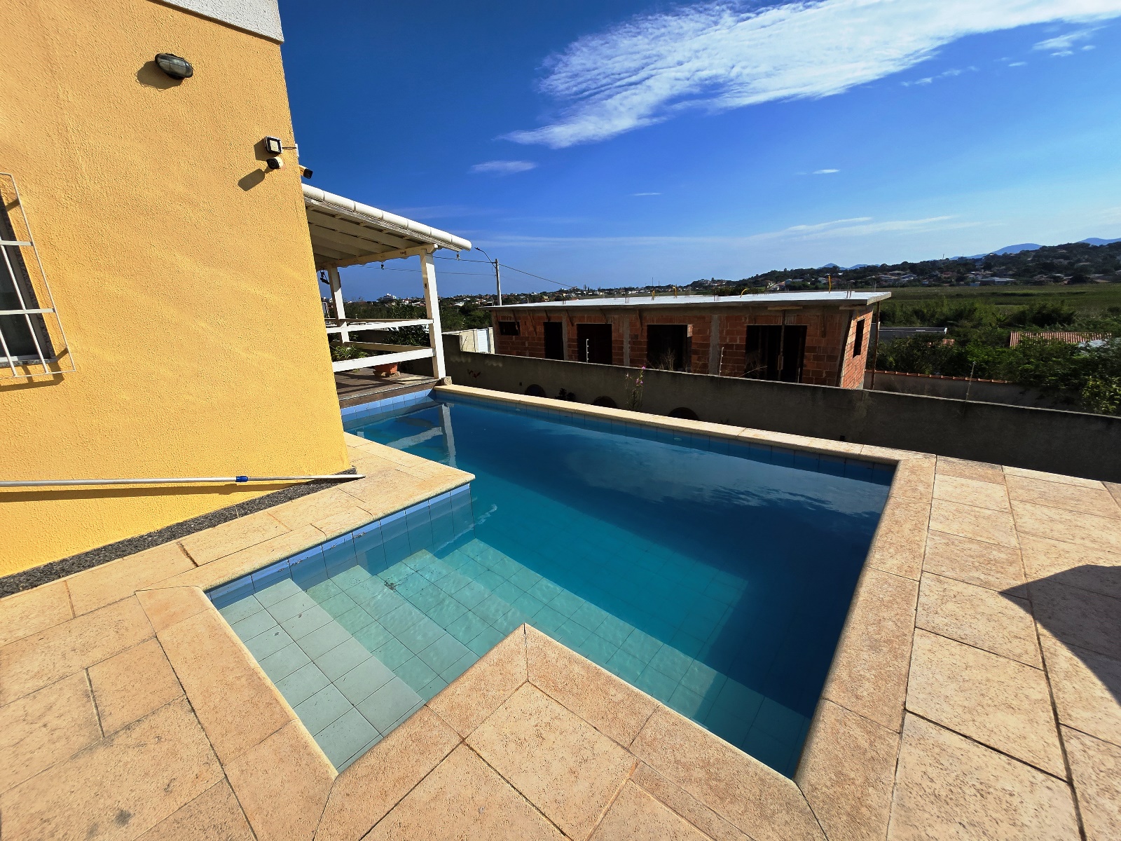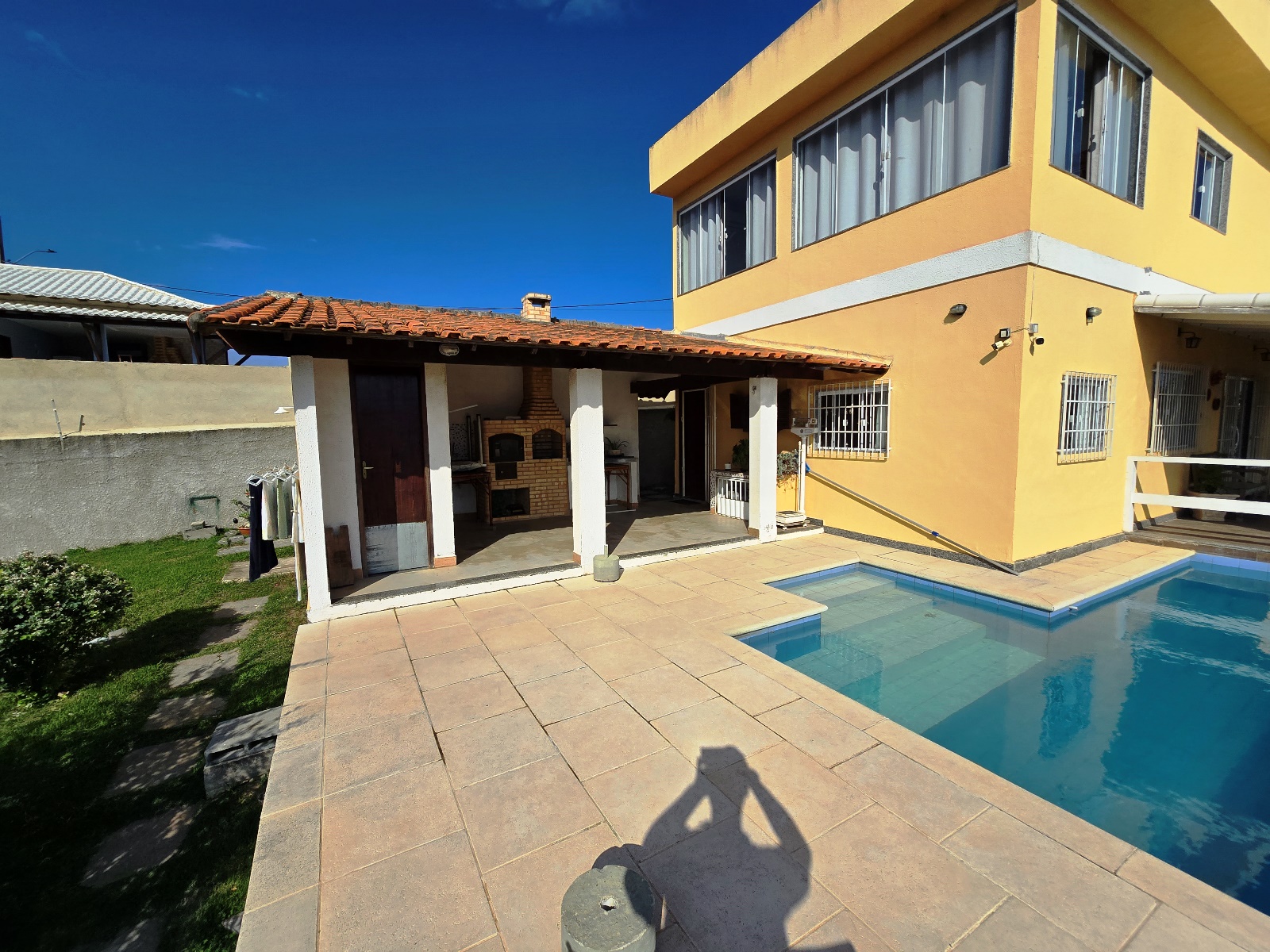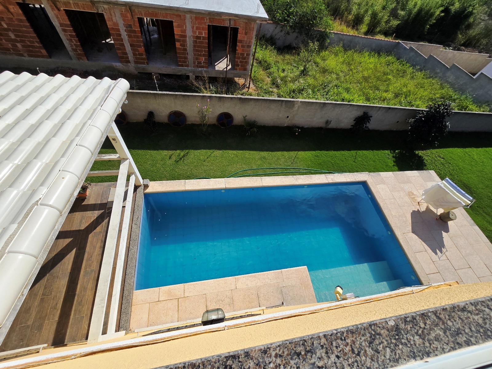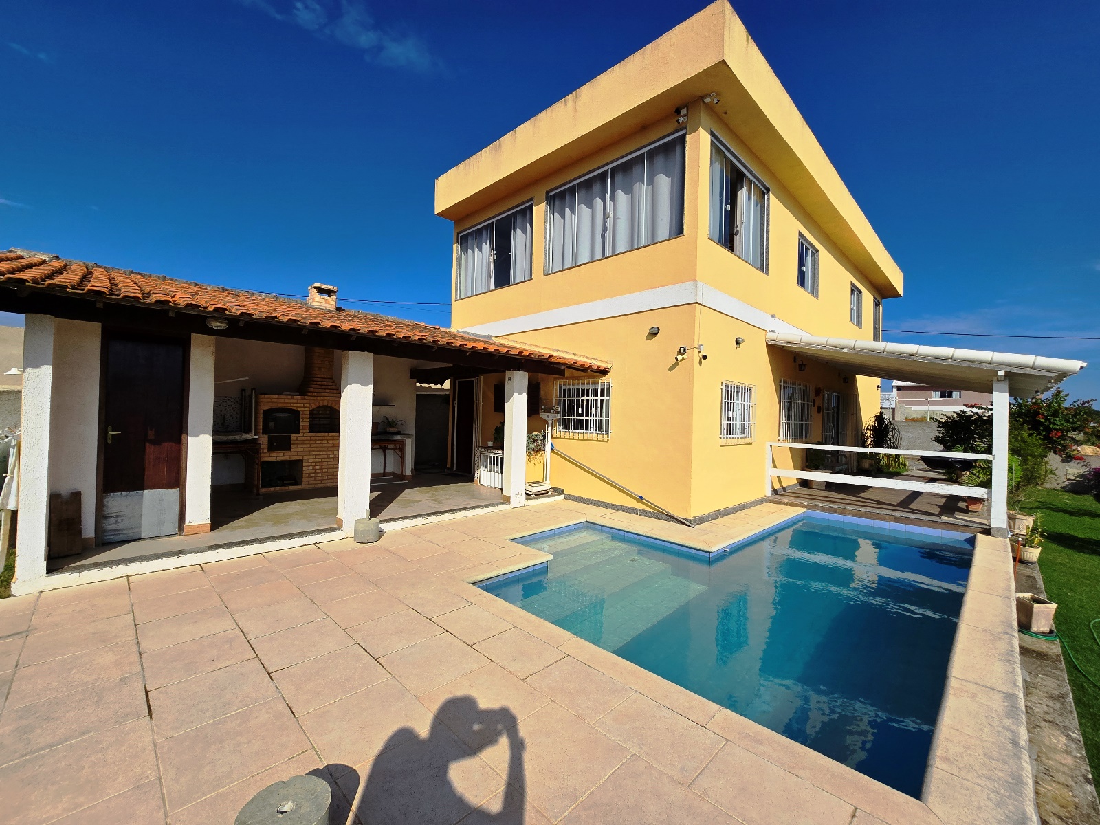 Área externa integrada, frente com varanda e vaga para 03 carros, piscina e espaço churrasqueira/área gourmet com banheiro social e campinho de futebol.